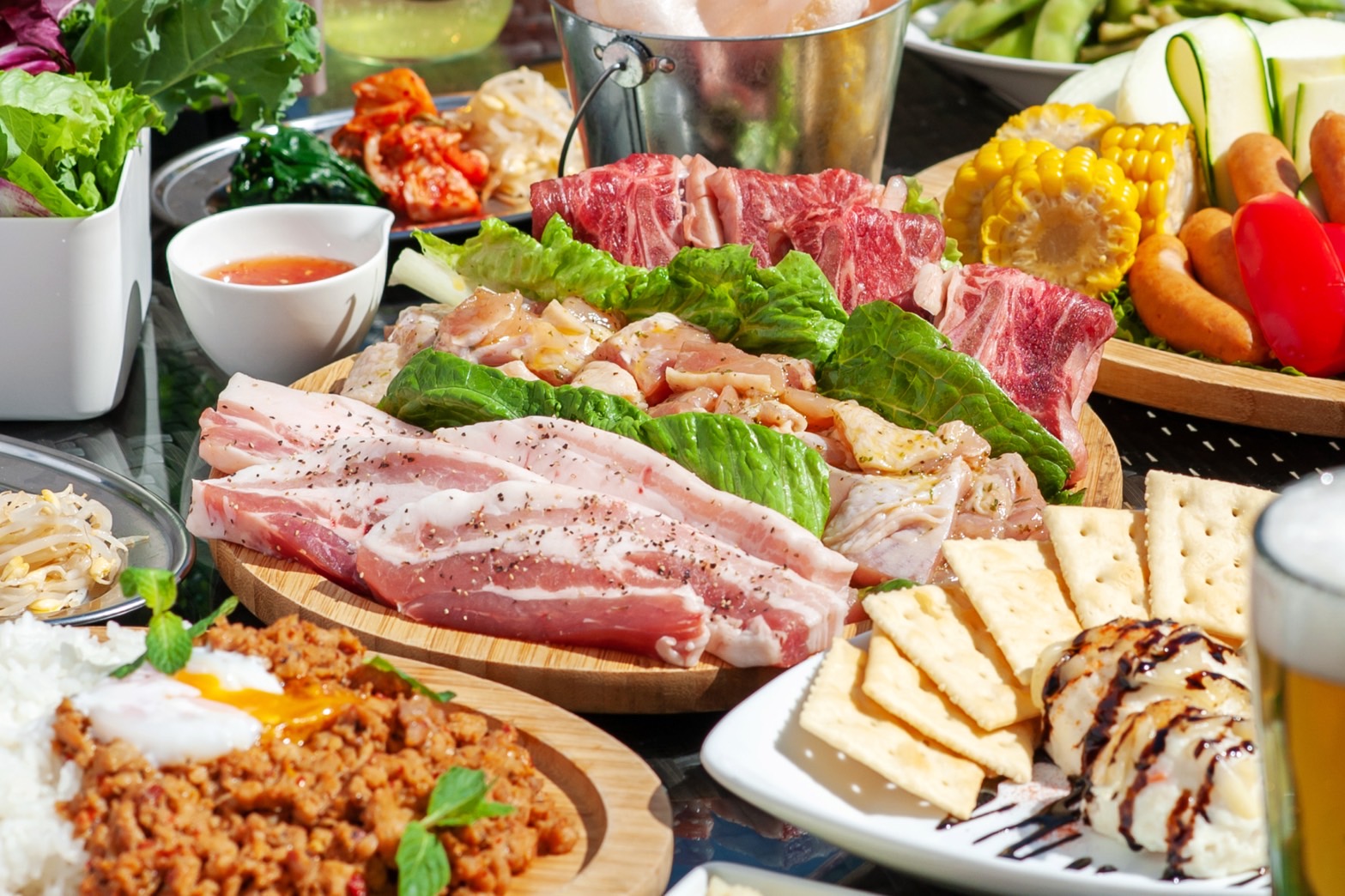 ご提供するのは、前菜・焼き野菜・肉料理・〆ごはん・デザートまで揃った全6品に、90分飲み放題が付いた「焼肉×ビアガーデンセット」。手ぶらで本格BBQを楽しめる充実の内容で、お一人様5,500円、小学生は半額にてご利用いただけます。
