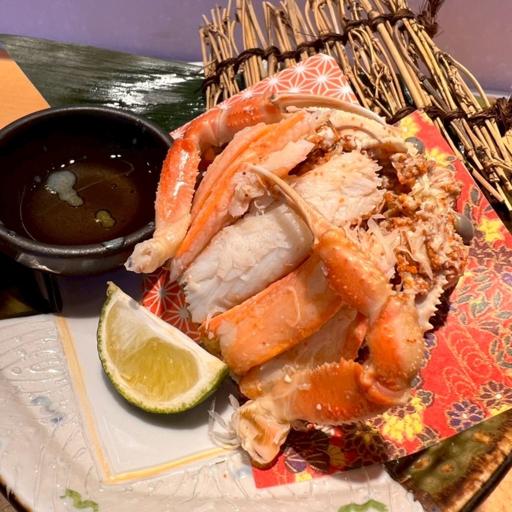 カニ足と内子・外子を甲羅に盛り付けた贅沢な一品です。小さな身出しも丁寧に行い、香箱ガニの美味しさを存分に味わえます。