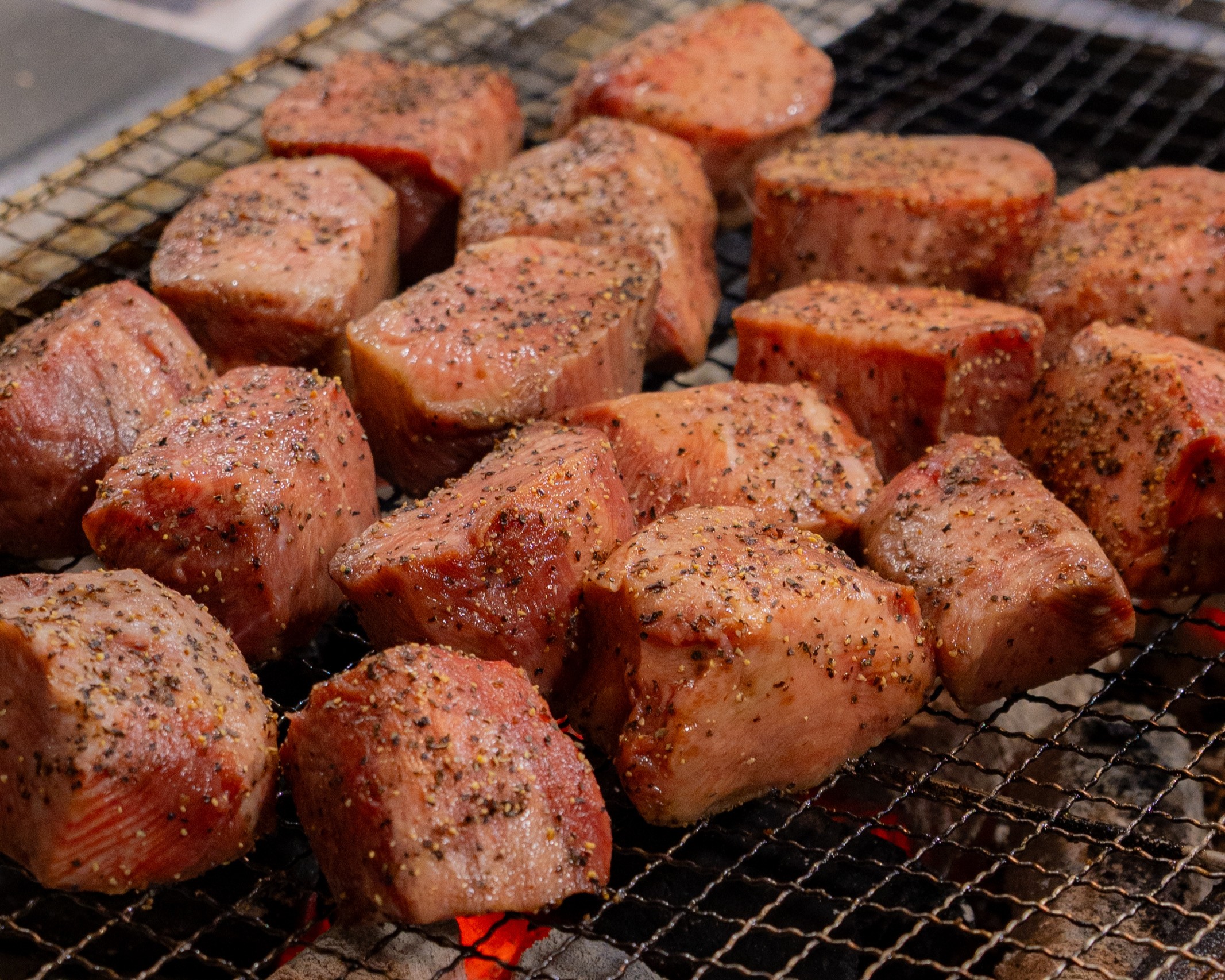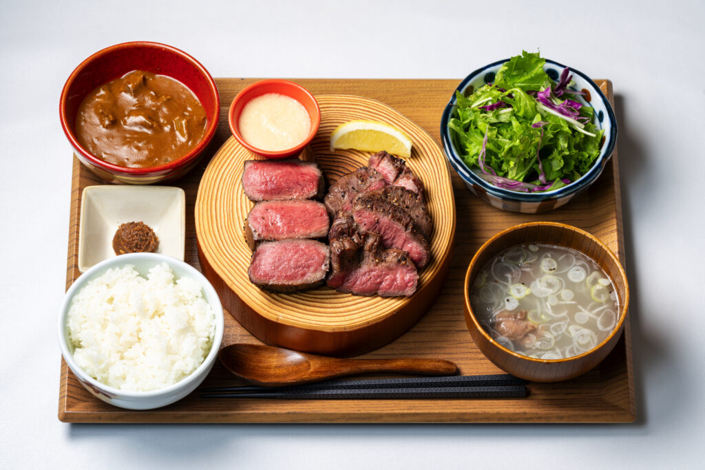 看板商品である“名物「極み」ステーキ”は、この「たん元」を熟練の職人が高級備長炭でじっくり焼き上げます。表面を高温で香ばしく焼き上げた後、時間をかけて中まで火を入れる独自の調理法により、柔らかさ・ジューシーさ・深い旨みを最大限に引き出しています。厚切りならではの迫力ある見た目と美しいレア感、箸で感じるずっしりとした重み、噛むごとに広がる旨みが、国内外の食通を魅了しています。