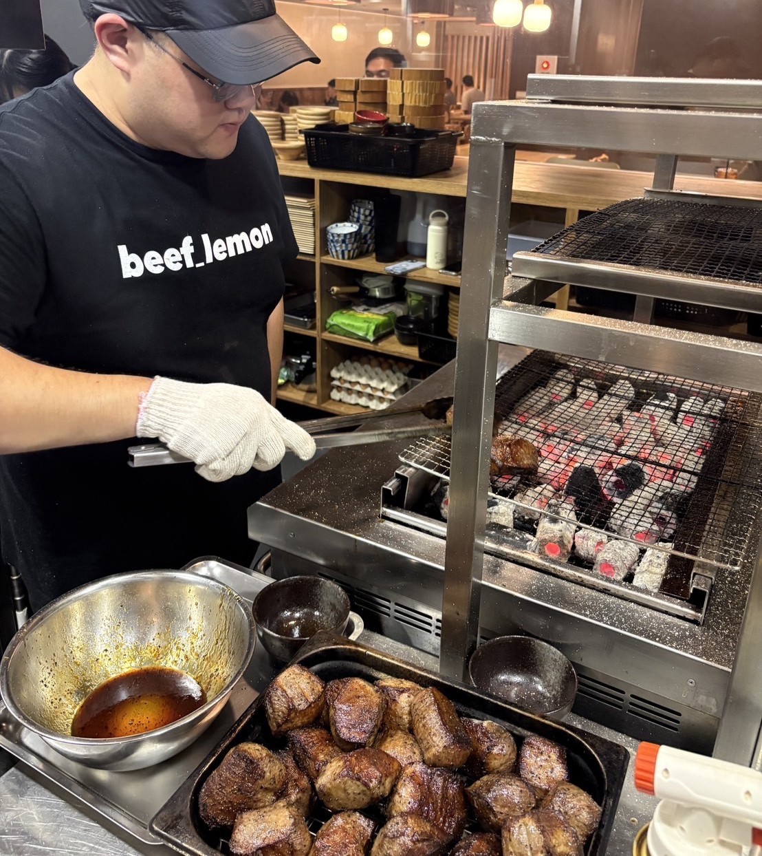 炭火で厚切り牛たんを焼き上げる現地スタッフ。「牛たんの檸檸 台北店」でも、本部のトレーニングを基にしたオペレーションが行われています。