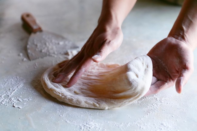 ピザ生地は、工房で職人が気温や湿度によって配合を微調整して作ります。ふっくらと発酵した生地を一枚一枚職人が手伸ばしで形成。手間がかかりますが、実直な工程がおいしさに結びつきます。