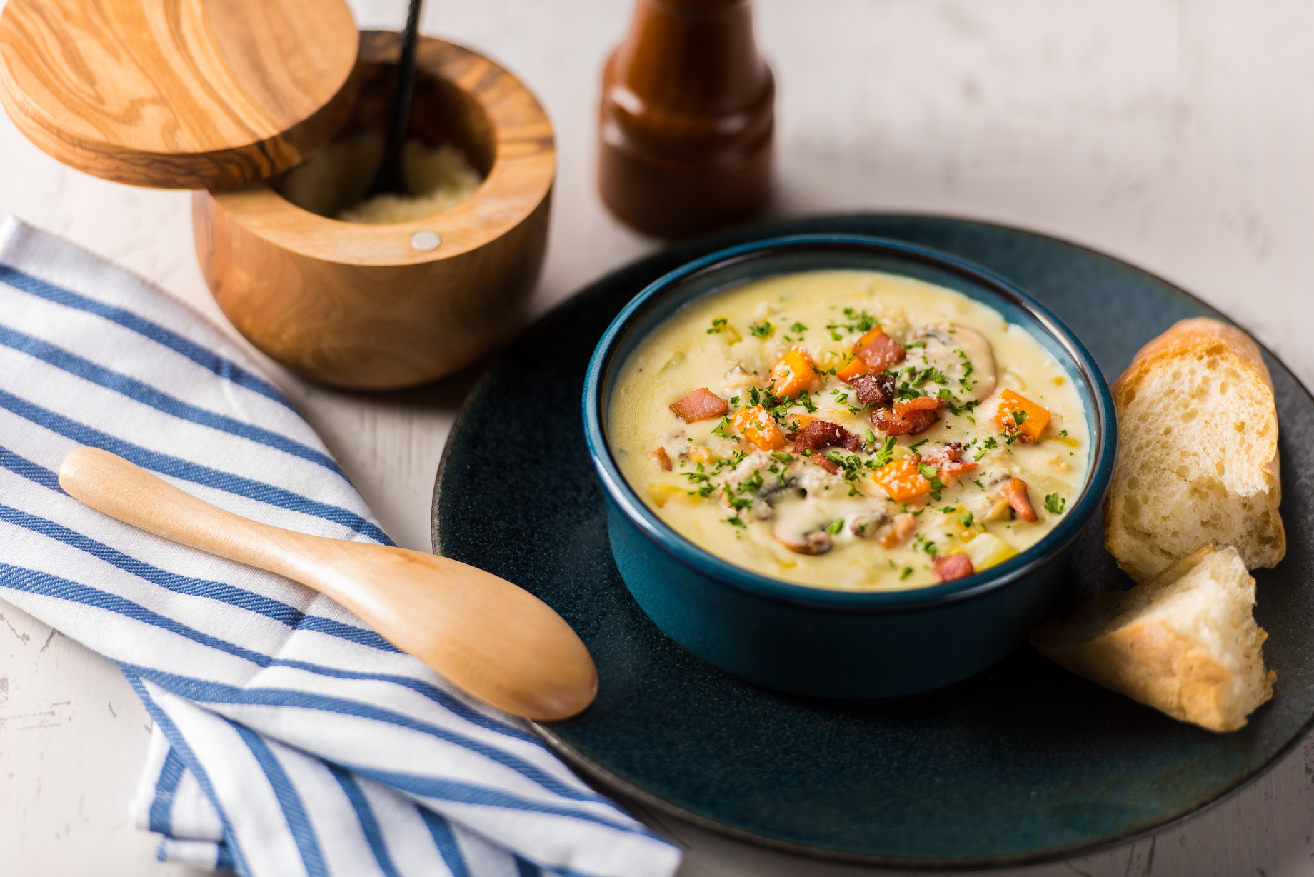 クラムチャウダーは、旨みたっぷりの肉厚あさりのだしとごろごろ野菜の入ったクラムチャウダーはアメリカ東海岸発祥です。サブリナ名物はクリーミーなミルクの甘みのニューイングランド風を自家燻製ベーコンを入れてさらに食べごたえある味わいに仕上がっています。サイズは色々。パスタのとなりのサイドディッシュとして、時にはしっかりとしたお食事スープとして。このクラムチャウダーに合わせたブレッドに浸しながらお召し上がりください。